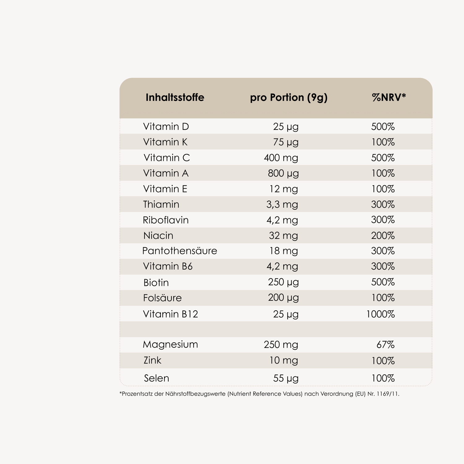 Viele der enthaltenen Vitamine und Mineralstoffe unterstützen sich bei der Aufnahme gegenseitig. Durch diese gezielte Kombination entsteht ein Synergie-Effekt, der eine noch bessere Bioverfügbarkeit ermöglicht und die Nährstoffe dem Körper besonders effizient zur Verfügung stellt.