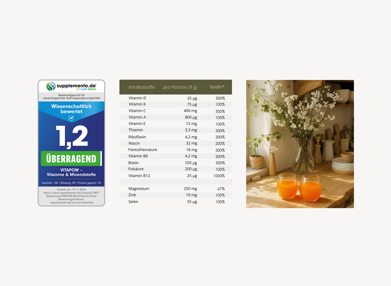 Vitapow vereint Vitamine und Mineralstoffe mit wertvollen Superfoods sowie hochwertigen Obst- und Gemüsepulvern.