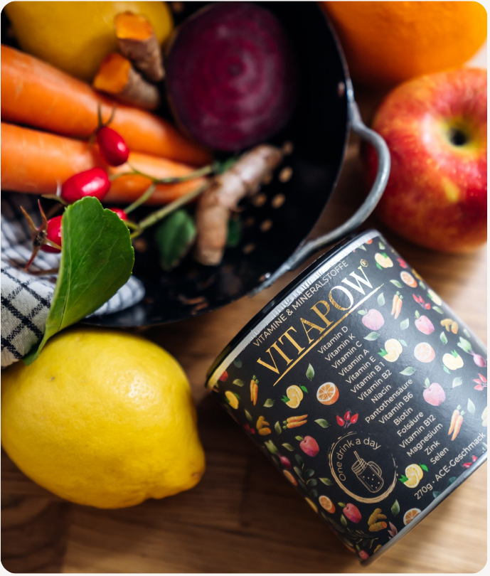 Vitapow vereint alle 13 Vitamine, essenzielle Mineralstoffe, wertvolle Superfoods, natürliche Ballaststoffe sowie hochwertige Obst- und Gemüsepulver.