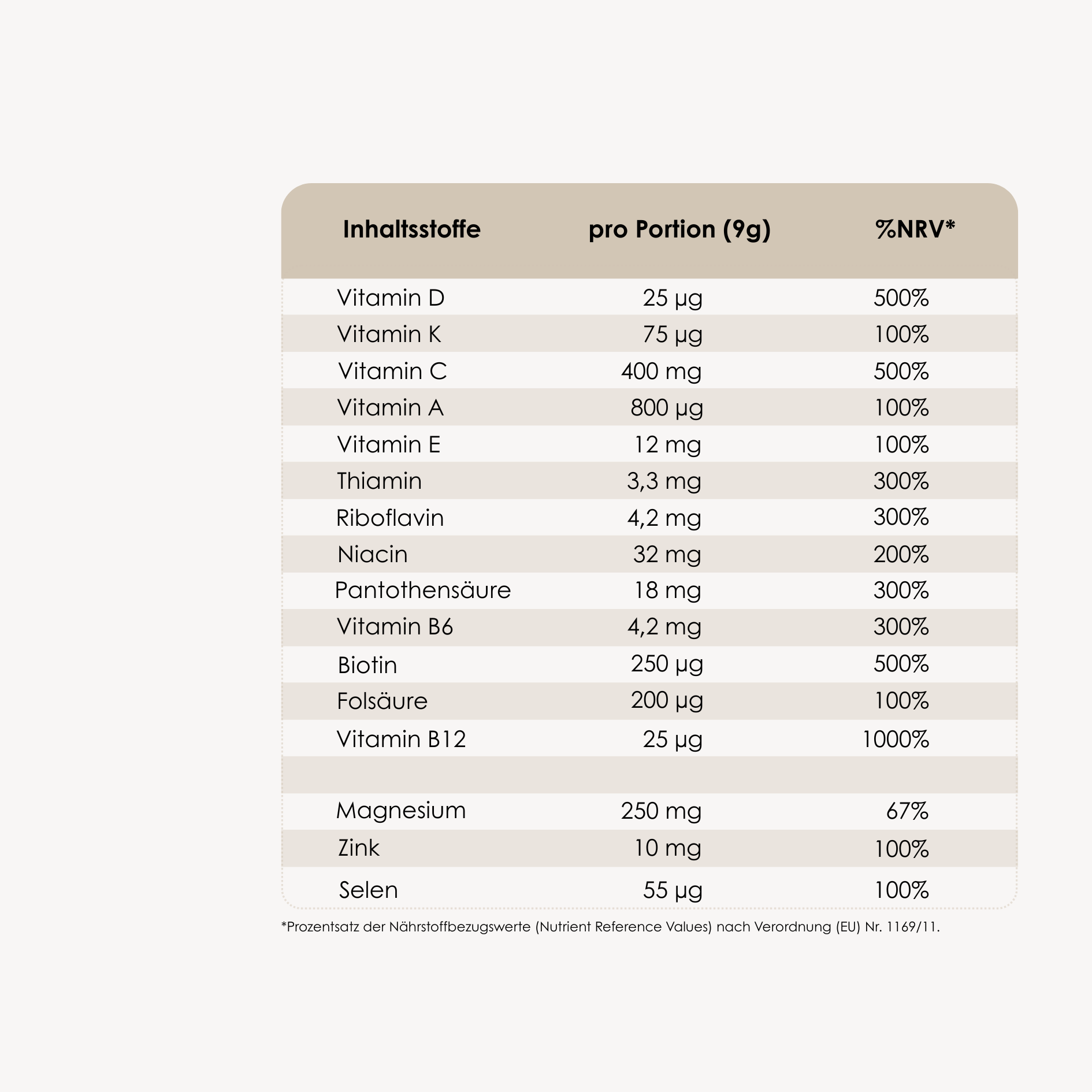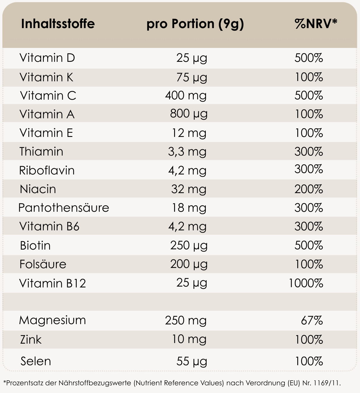 Viele der enthaltenen Vitamine und Mineralstoffe unterstützen sich bei der Aufnahme gegenseitig. Durch diese gezielte Kombination entsteht ein Synergie-Effekt, der eine noch bessere Bioverfügbarkeit ermöglicht und die Nährstoffe dem Körper besonders effizient zur Verfügung stellt.