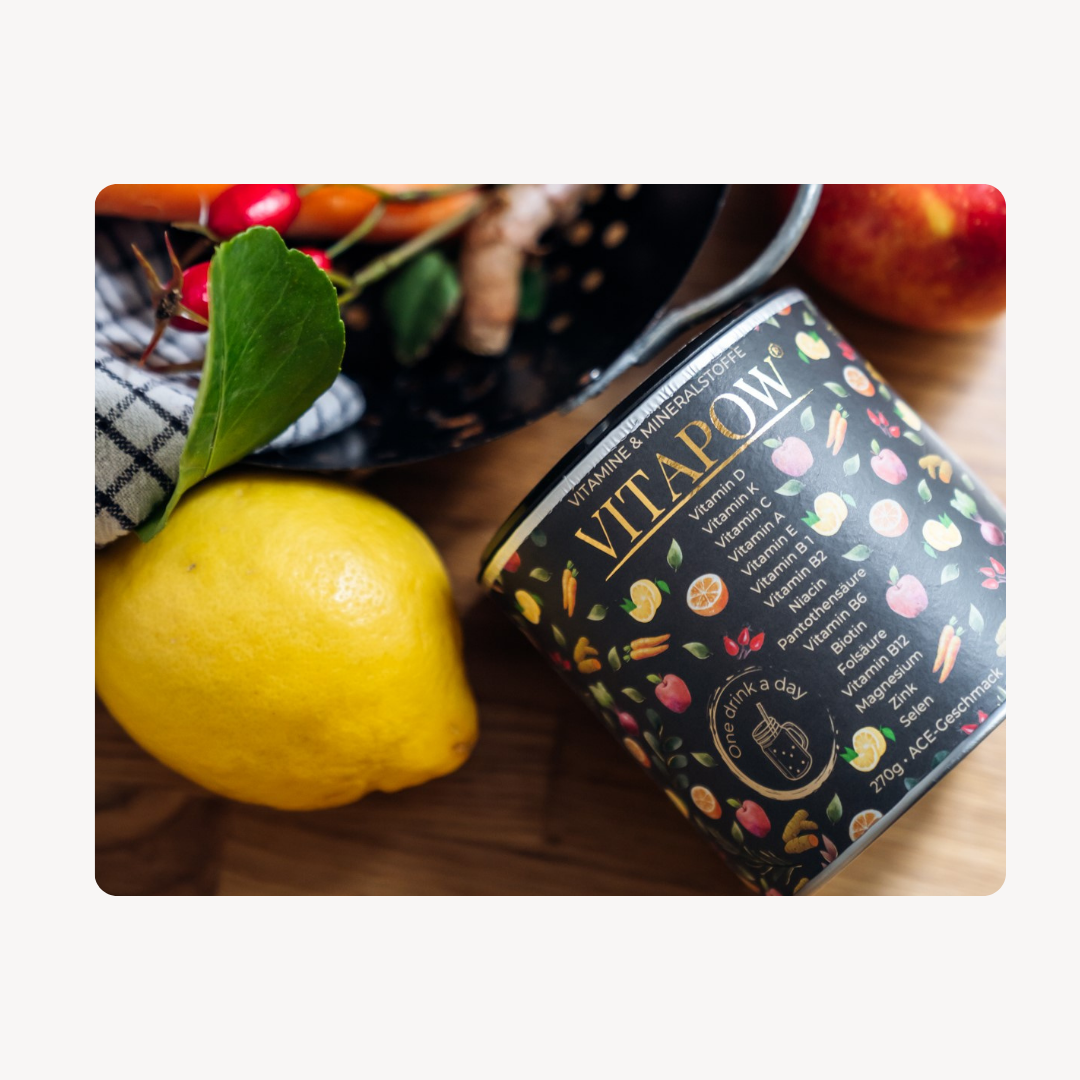 Die in Vitapow enthaltenen Vitamine A, B6, B12, C, D sowie Selen und Zink unterstützen die normale Funktion des Immunsystems.